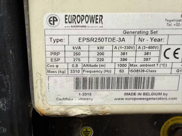 Brand: Europower Type: EPSR250TDE-3A Year of construction: 2021 Fuel: Diesel Power: 250 kVA Voltage: 400 V Current: 397 A Machine weight: 3310 kg Color: white
