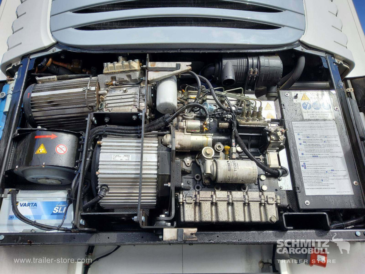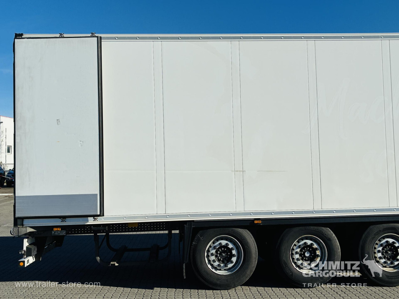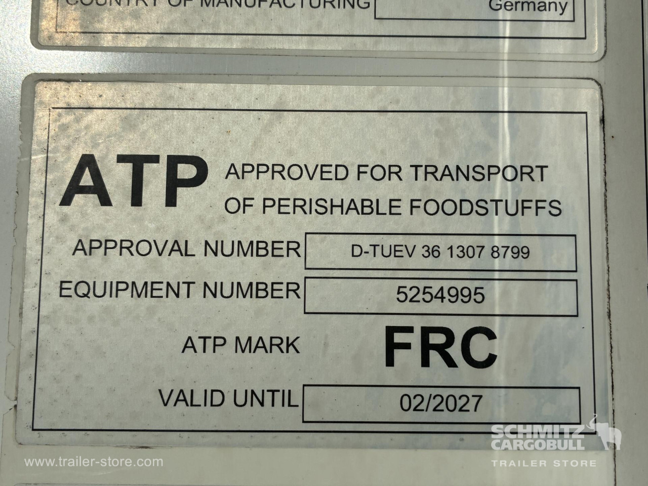Remarks: **Safety**\\Rear underrun, Antilock Braking System ABS, Telematics system\\\\**Interior**\\Double deck with beams\\\\**Exterior**\\Air suspension, Spare wheel carrier double, Bolted chassis, Gantry doors, 1x15 and 2x7 pin plug, Antispray\\\\**Cargo securing**\\Cargo securing with certificate, DIN EN 12642 (code XL) certificate\\\\**Brake system**\\Disc brake, Schmitz ROTOS\\\\**Floor**\\Aluminum floor\\\\**Wand**\\Stirnwand verstärkt\\\\**Wall**\\Frontwall recess for cooling, Wall thickness45 mm\\\\**Cooling unit**\\Schmitz Cargobull S.CU V 1.0, Diesel/Elektro, 2.184 Operating hours Diesel, 1.281 Operating hours electric\\\\**Loading area**\\Length 13.403 mm, Width 2.490 mm, Height 2.650 mm, Volume 88 m³\\\\**Tyre sizes**\\1. Achse: 385/65 R22.5 , Tread depth: 15 mm / 15 mm, 2. Achse: 385/65 R22.5 , Tread depth: 11 mm / 11 mm, 3. Achse: 385/65 R22.5 , Tread depth: 15 mm / 15 mm\\\\**Other dimensions and weights**\\GVW: 36.000 kg\\\\----
