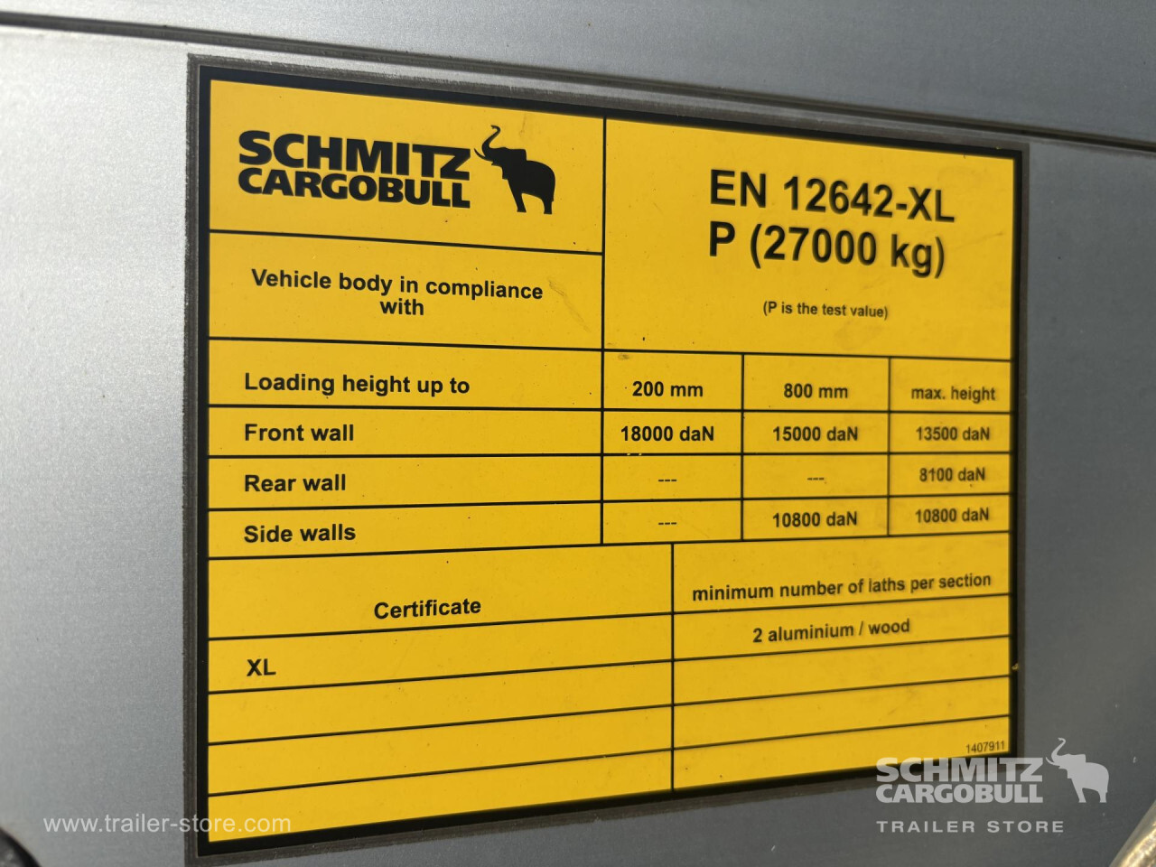 Remarks: **Safety**\\Rear underrun, Antilock Braking System ABS, Fire extinguisher holder\\\\**Exterior**\\Air suspension, Toolbox 2x, Spare wheel carrier double, Bolted chassis, Sliding roof, 1x15 and 2x7 pin plug, Antispray\\\\**Cargo securing**\\DIN EN 12642 (code XL) certificate, Aluminium slats\\\\**Brake system**\\Disc brake, Schmitz ROTOS\\\\**Loading area**\\Length 13.620 mm, Width 2.480 mm, Height 2.780 mm, Volume 93 m³\\\\**Tyre sizes**\\1. Achse: 385/65 R22.5 , Tread depth: 15 mm / 14 mm, 2. Achse: 385/65 R22.5 , Tread depth: 10 mm / 10 mm, 3. Achse: 385/65 R22.5 , Tread depth: 16 mm / 15 mm\\\\**Other dimensions and weights**\\Payload: 32.472 kg, GVW: 39.000 kg, Wheel base: 7.700 mm\\\\----