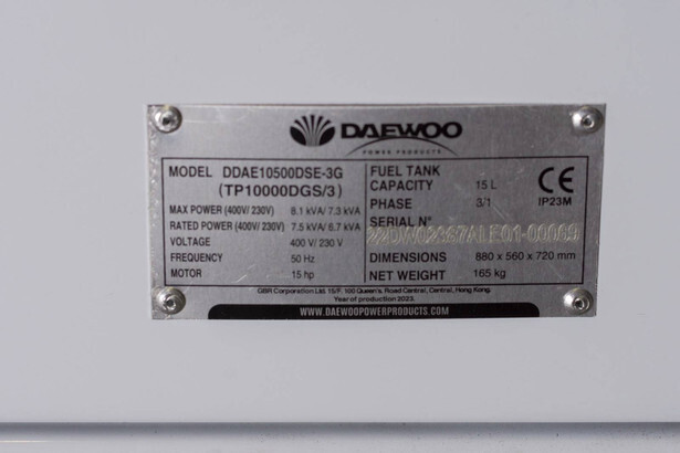 Brand: Daewoo Type: DDAE10500DSE-3G Year of construction: 2023 Fuel: Diesel Engine Brand: Daewoo Power: 8.1 kVA Voltage: 400 V Reading operating hours: 0 h Machine weight: 165 kg Color: gray Dimensions: 880x560x720 mm