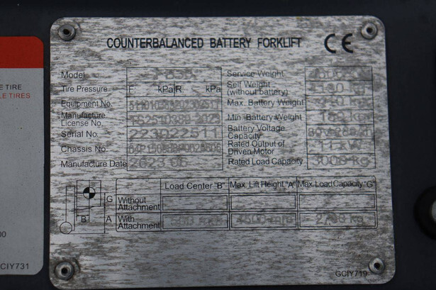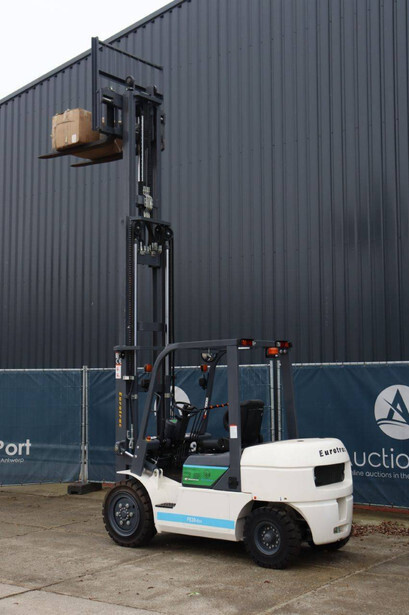 Brand: Eurotrac Type: FE30-Eco Serial number: 223022511 Year of construction: 2023 Fuel: Electric Mast type: Triplex Sideshift: No Lifting capacity: 3000 kg Lifting height: 4500 mm Reading operating hours: 12 h Tires: Solid tires Color: white