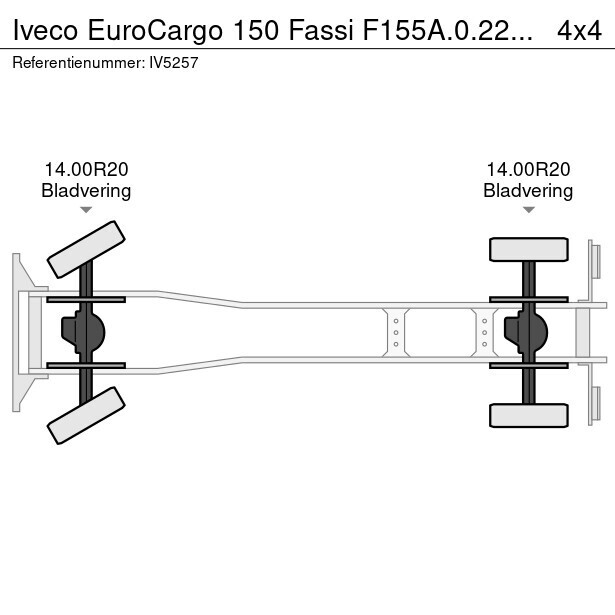 Equipped with Fassi crane and flatbed: Type: F155A.0.22 Lifting moment: 133 KNm. Standard hydraulic reach: 8.30 mtr. Load at the max horizontal outreach: 1.660 kg. Hydraulically extra extendable outriggers Long fixing rods