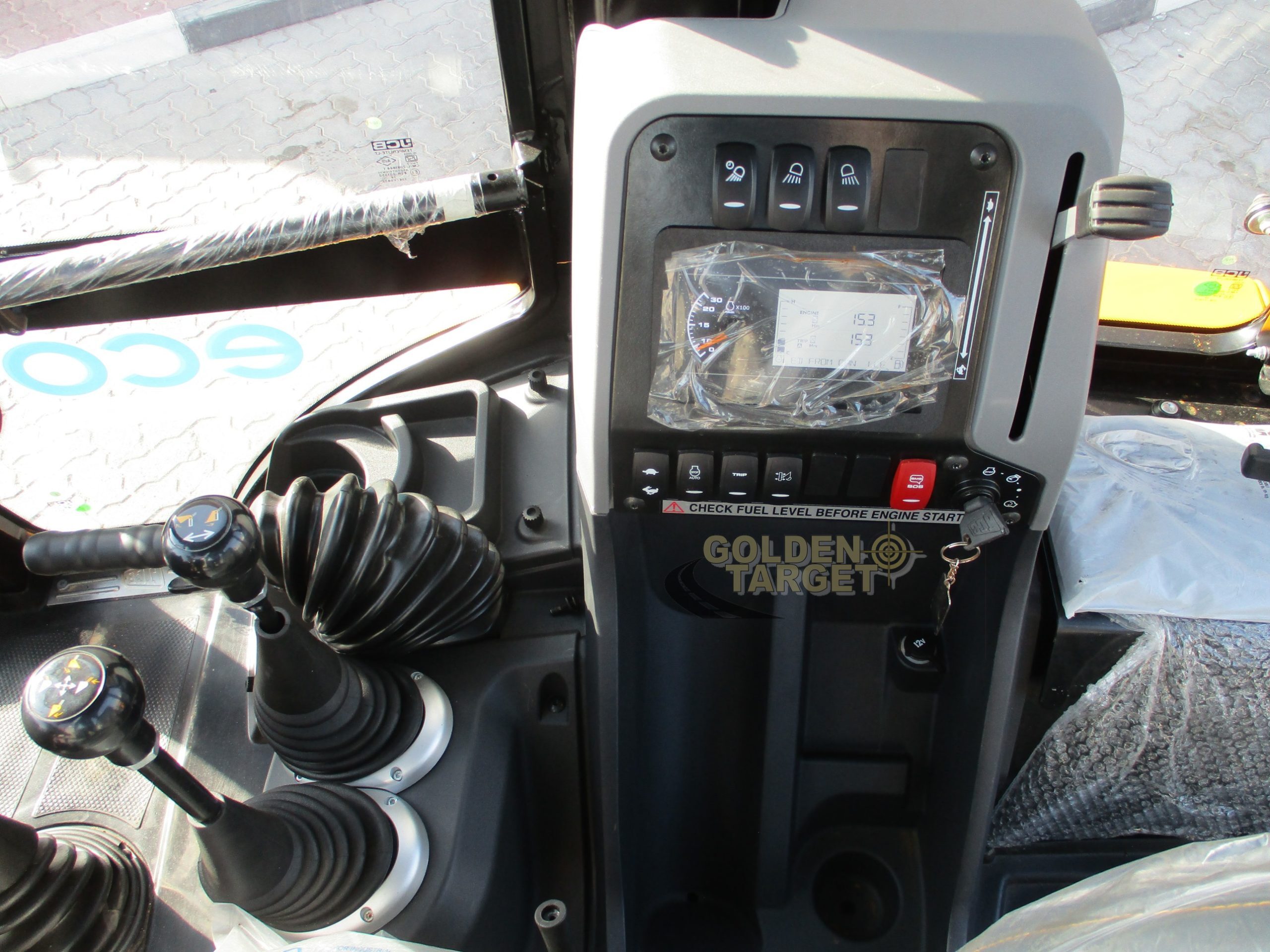 Backhoe Pilot Controls, 4 Cylinder Diesel Engine; 74 HP; Manual Transmission, 2350 mm multi-Purpose 4in1 Loader Bucket, Hydraulic Quick Coupler, Enclosed A/C Cab.