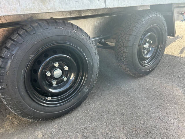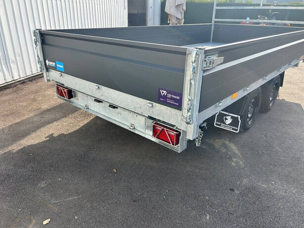 Heavy duty tipper Fully welded and hot-dip galvanized chassis Standard with battery charger Parabolic suspension incl. shock absorbers, tires 185/70R13 C with black rim Steel plate floor TÜV-certified load securing system Unique board hinges Four removable corner posts 40 cm anthracite aluminum walls with robust built-in locks Extra heavy support wheel with customized special support wheel support Reinforced aluminum loading ramps Sturdy, folding support legs LED lighting Electric control and emergency pump and hydraulic cylinder Fitted with front rack as standard
