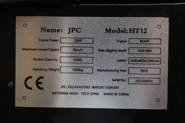 Brand: JPC Type: HT12 Serial number: 202503033 Year of construction: 2025 Fuel: Diesel Engine power: 12.0 HP Quick change: No Reading operating hours: 1 h Running gear: Tracks Machine weight: 1020 kg Color: orange