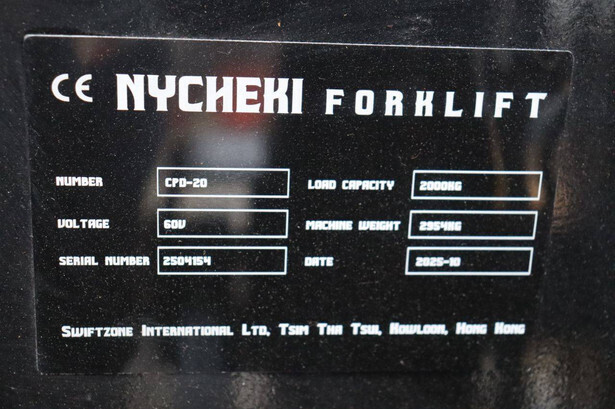 Brand: Nycheki Type: CPD-20 Serial number: 2504154 Year of construction: 2025 Fuel: Electric Mast type: Duplex Sideshift: Yes Lifting capacity: 2000 kg Lifting height: 4500 mm Reading operating hours: 8 h Machine weight: 2954 kg Tires: Solid tires Color: orange