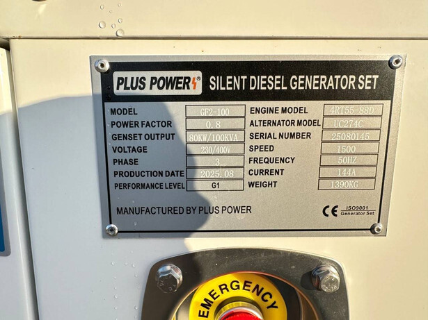 Brand: Plus Power Type: GF2-100 Serial number: 25080145 Year of construction: 2025 Fuel: Diesel Power: 88 kW