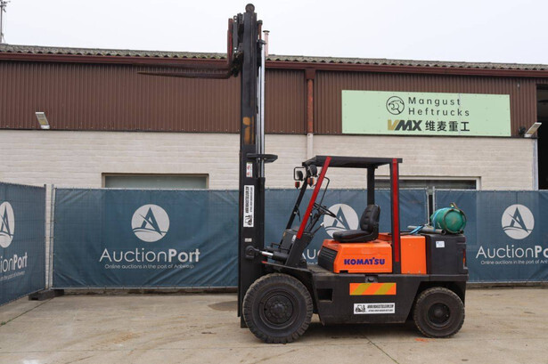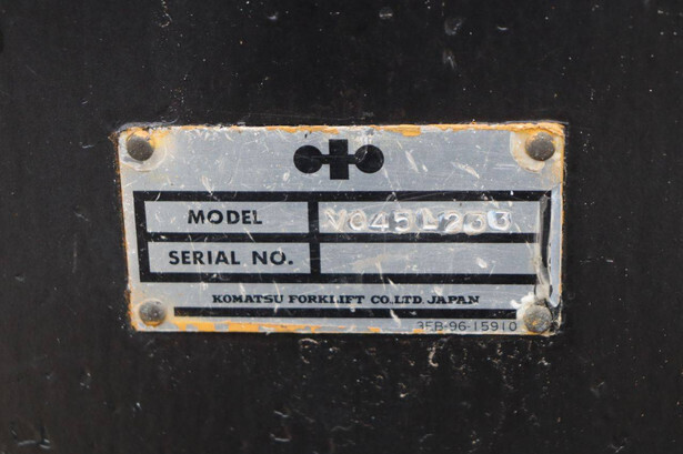 Brand: Komatsu Type: V045L233 Serial number: 3FB-96-15910 Year of construction: Not known Fuel: LPG Mast type: Duplex Sideshift: Yes Lifting capacity: Not known Lifting height: 4000 mm Operating hours read: 4060 h Tires: Solid tires Color: black