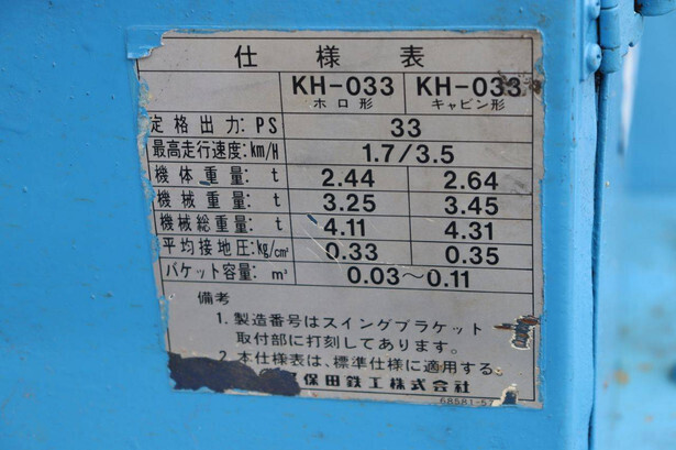 Brand: Kubota Type: KH-033 Serial Number: Not known Year of construction: Not known Fuel: Diesel Engine power: 33 HP Quick change: No Operating hours read: 4820 h Running gear: Tracks Machine weight: 2440 kg Color: blue Machine description: Machine is working.