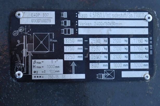 Brand: Linde Type: E40P Serial number: G1X337U00219 Fuel: Electric Mast type: Duplex Sideshift: No Lifting capacity: 2590 kg Lifting height: 3250 mm Operating hours read: 11476 h Tires: Solid tires Color: red